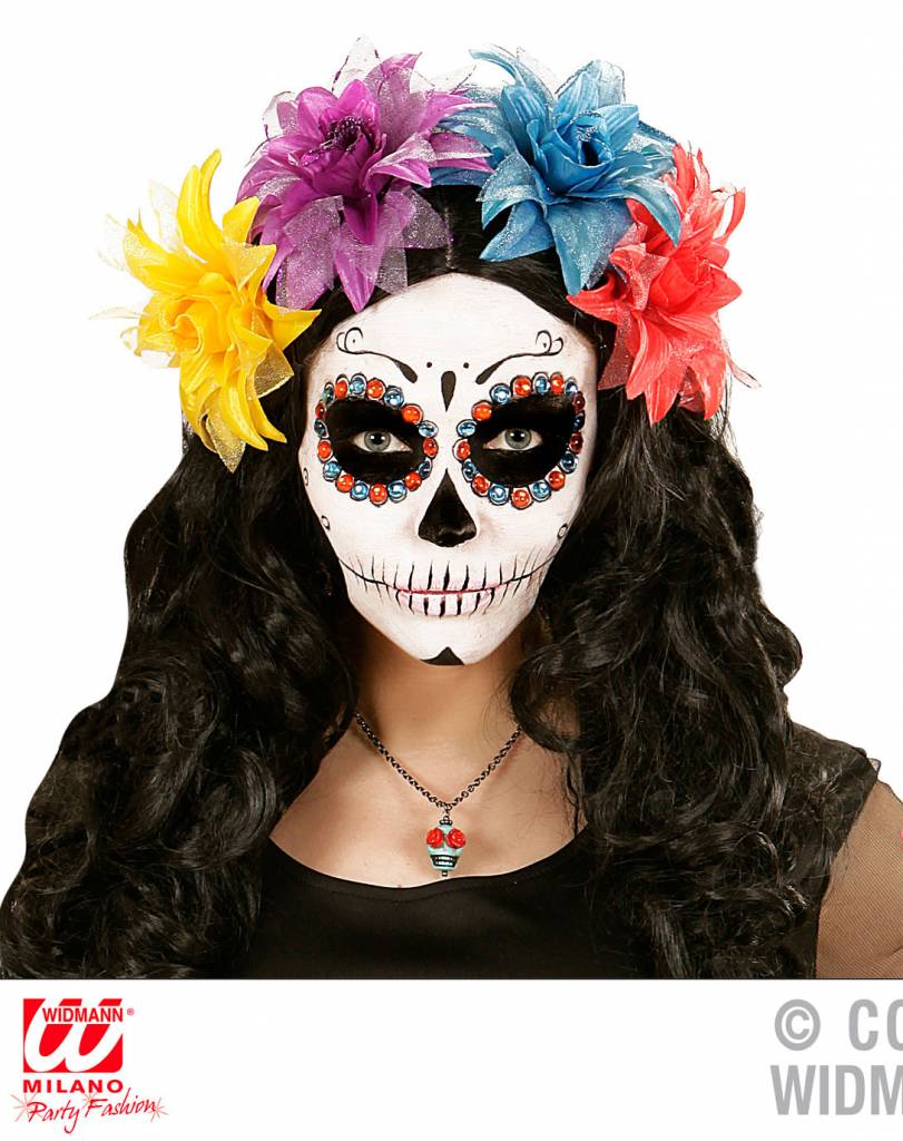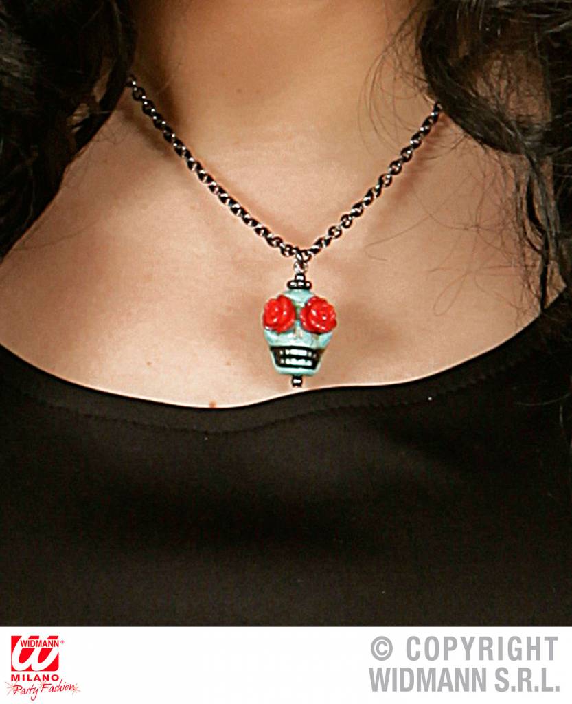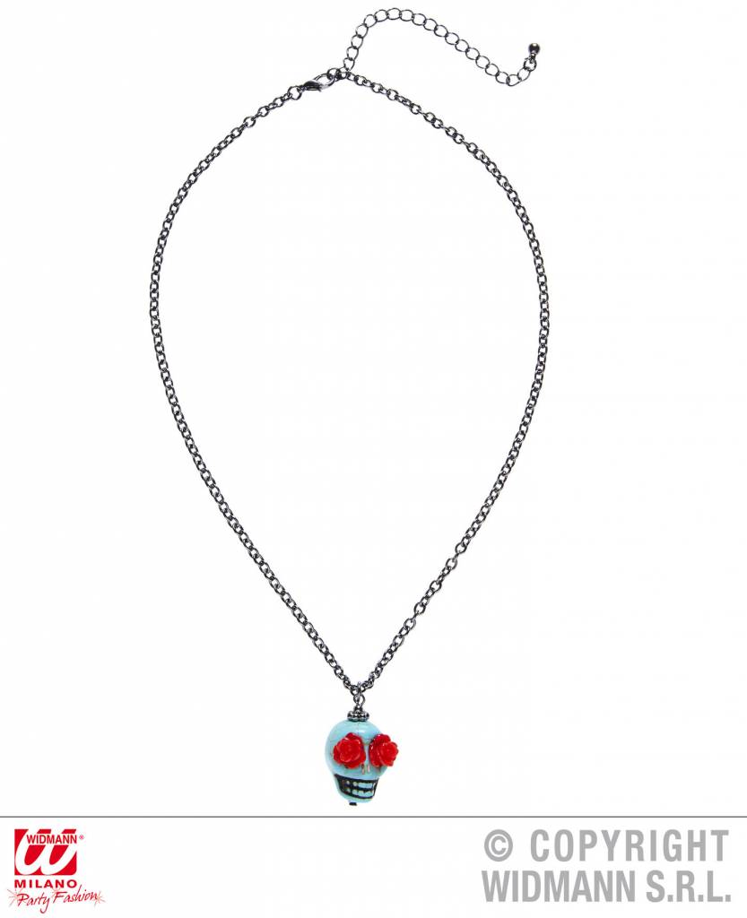 Halsketting met doodskopje en rode oogjes in de vorm van rode roosjes voor Halloween