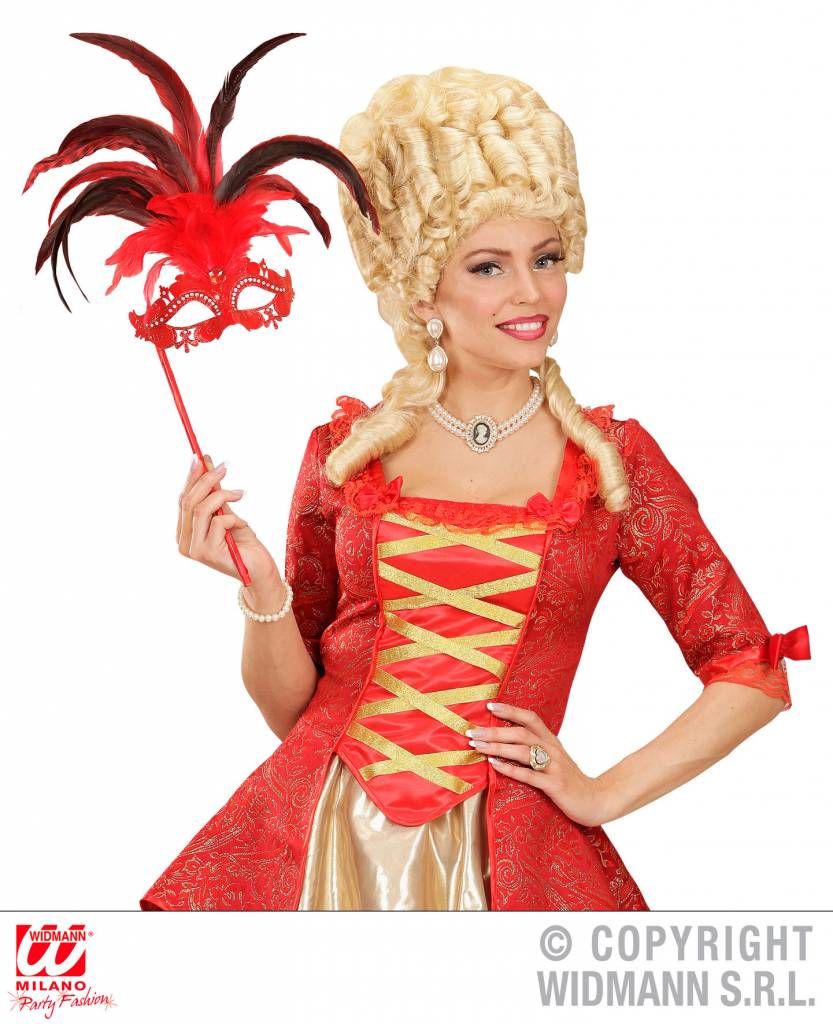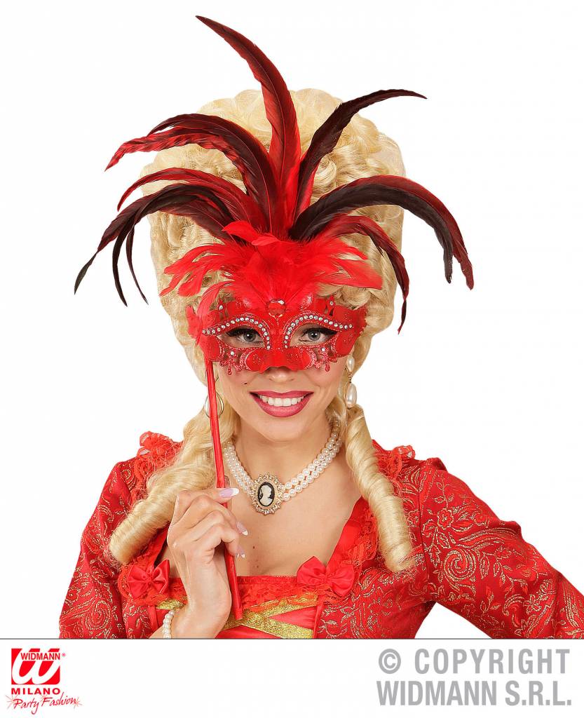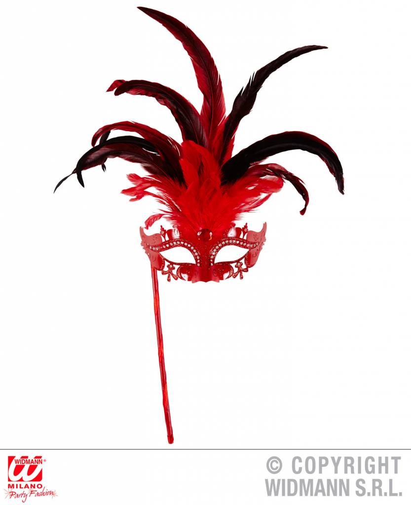 Rode oogmasker met veren op stokje met glitters (Nieuw2015-2016)