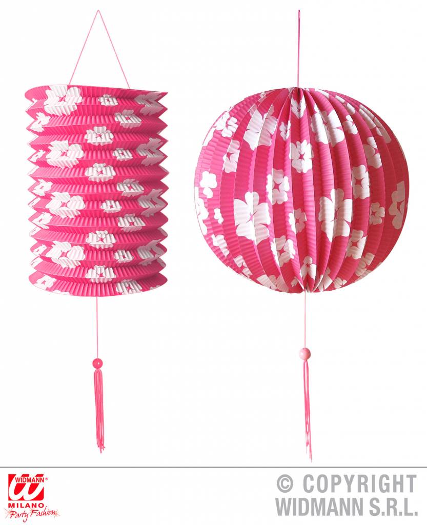 Set van 2 roze lampionnen. Deze set wordt geleverd met een roze cilinder lampion van 15 x 25 cm en een roze bol lampion met een diameter van 25cm.